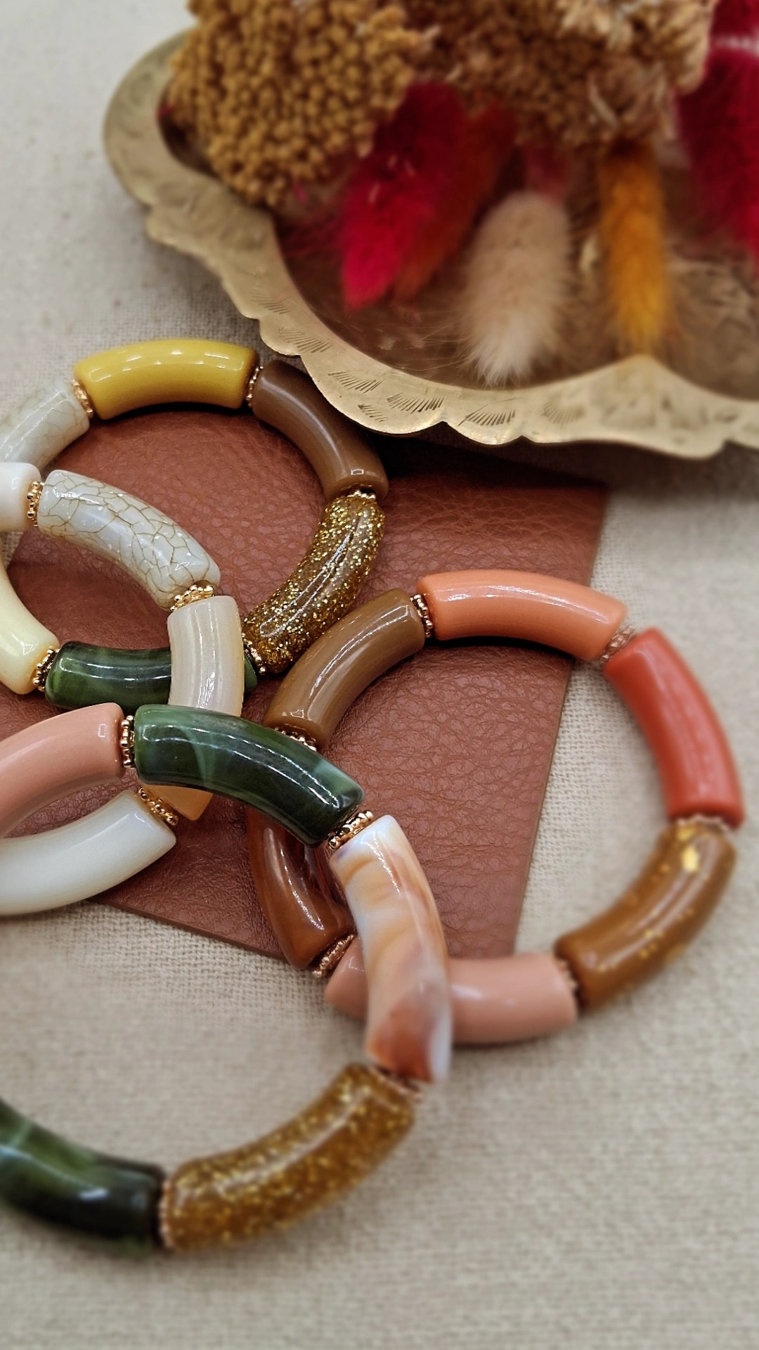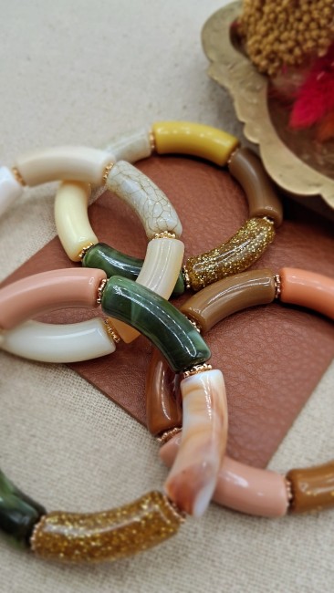 Bracelet en résine et sa belle perle à paillettes, monté sur élastique.