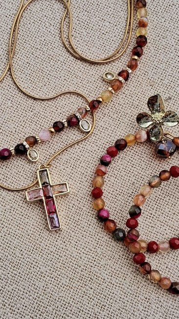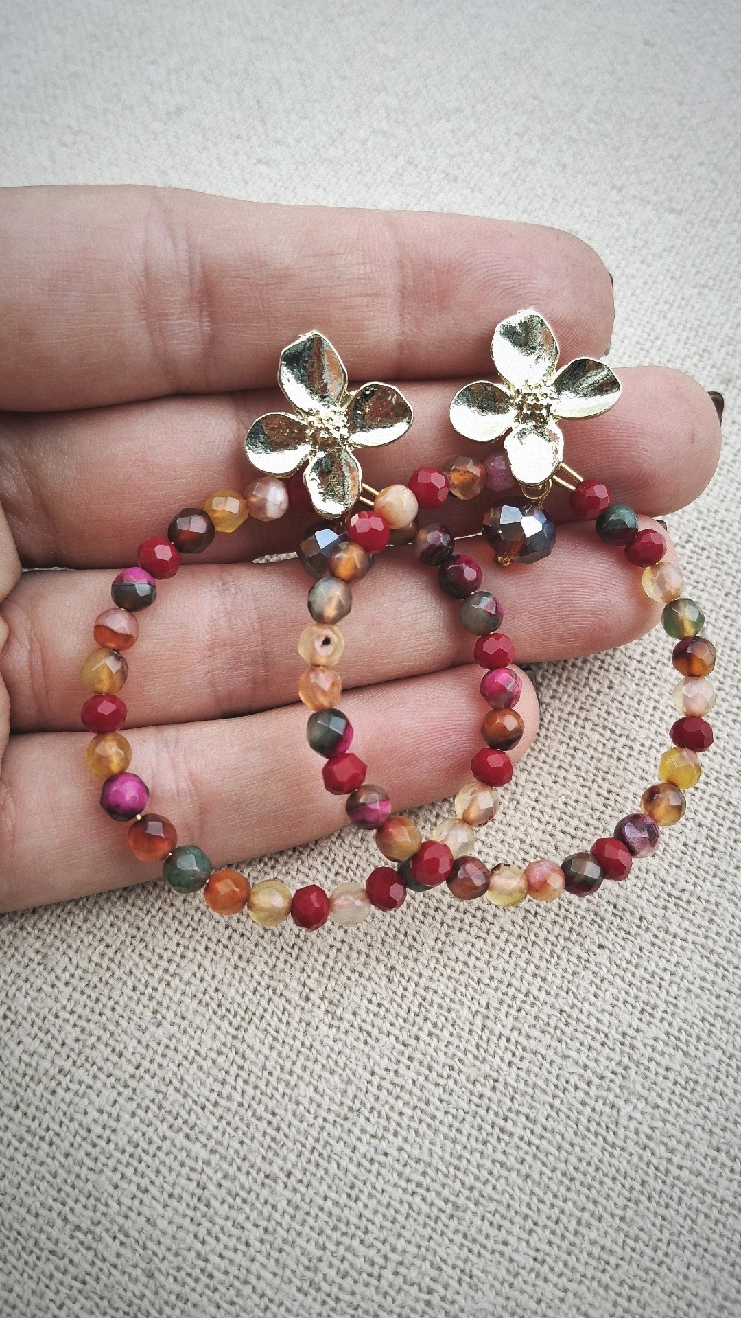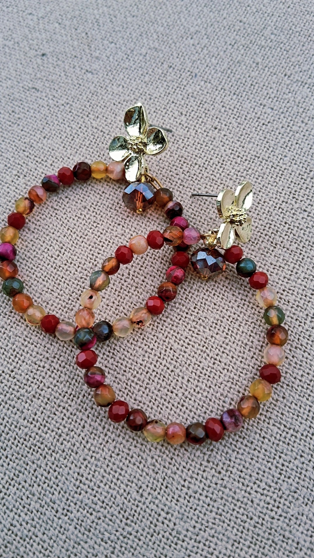 Descriptif: Boucles créoles en plaqué or et son camaïeu de perles en pierres naturelles et cristal.
