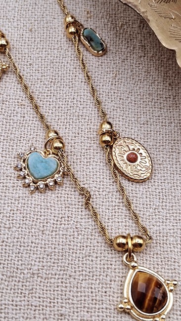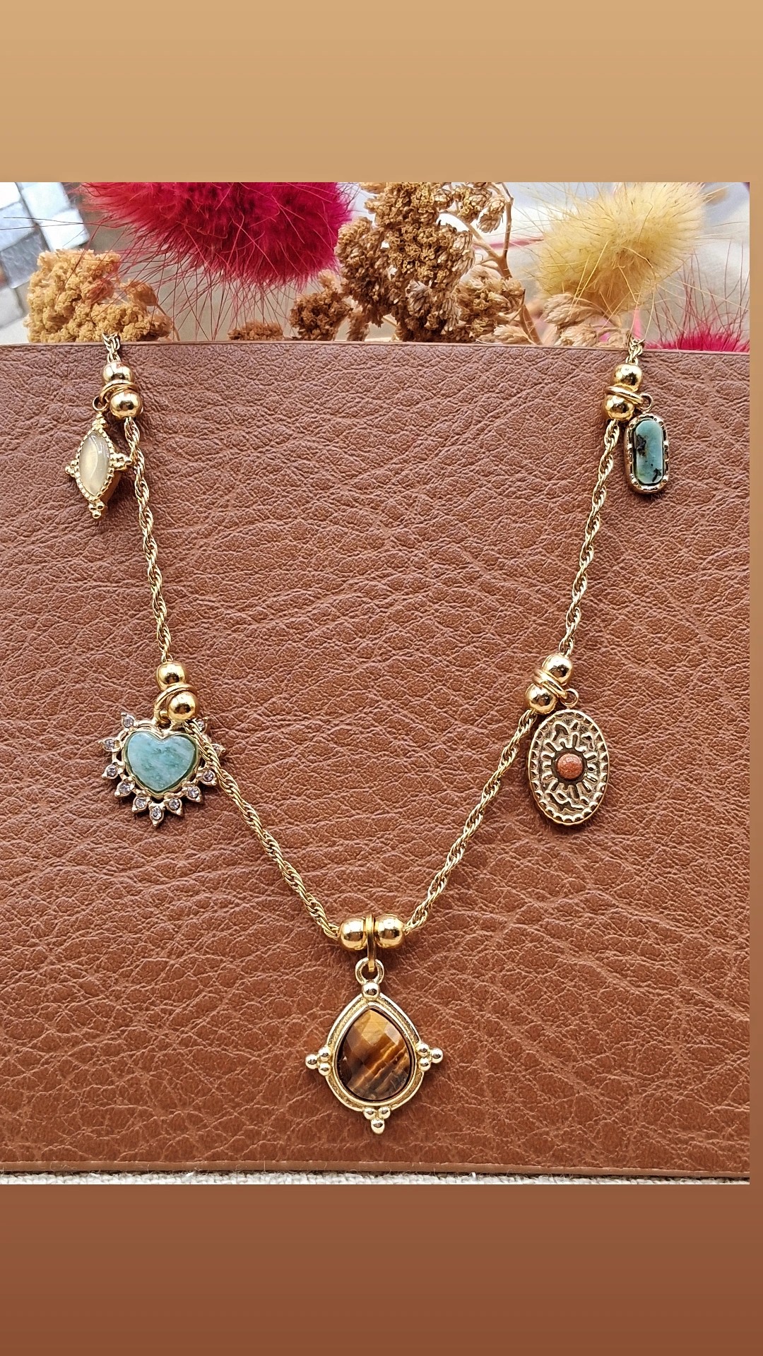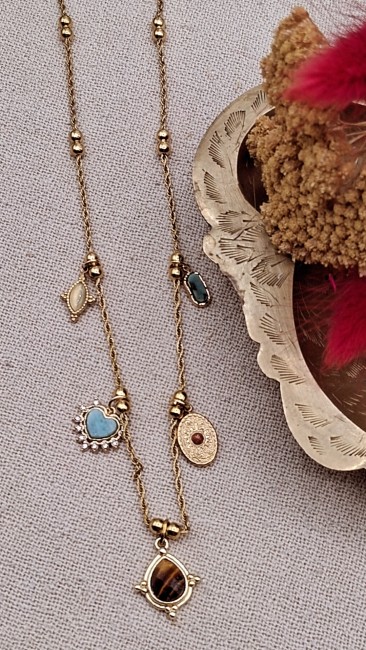 Collier en acier inoxydable et ses 5 magnifiques charm' (acier et plaqué or) et pierres naturelles.