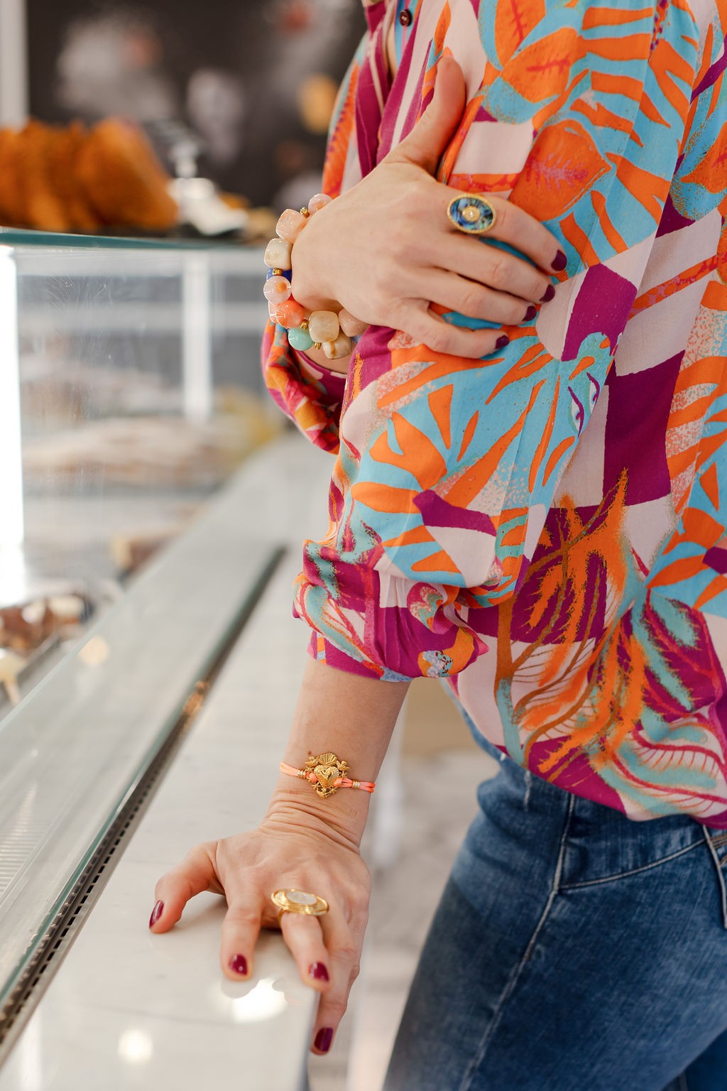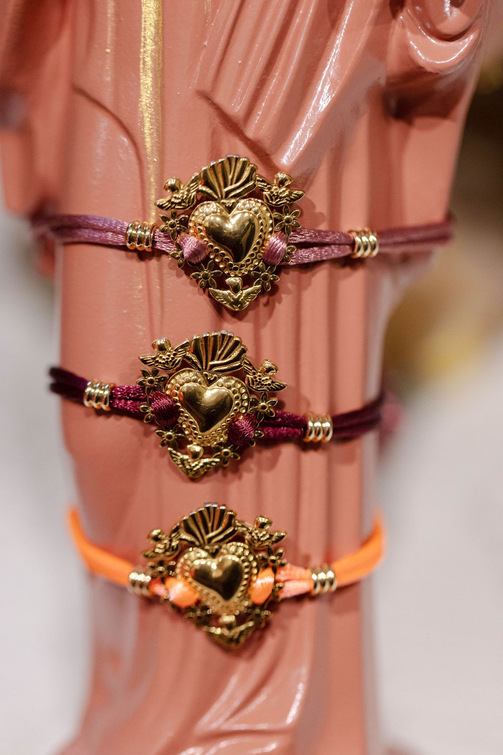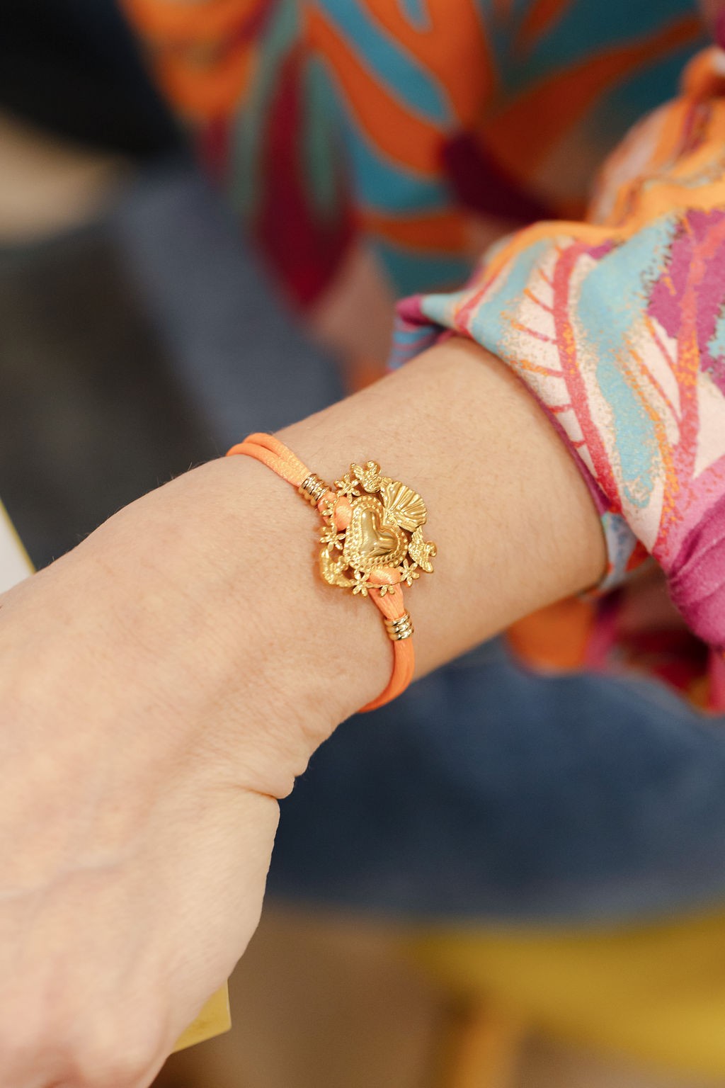 Bracelet monté sur fil satin et acier inoxydable doré.