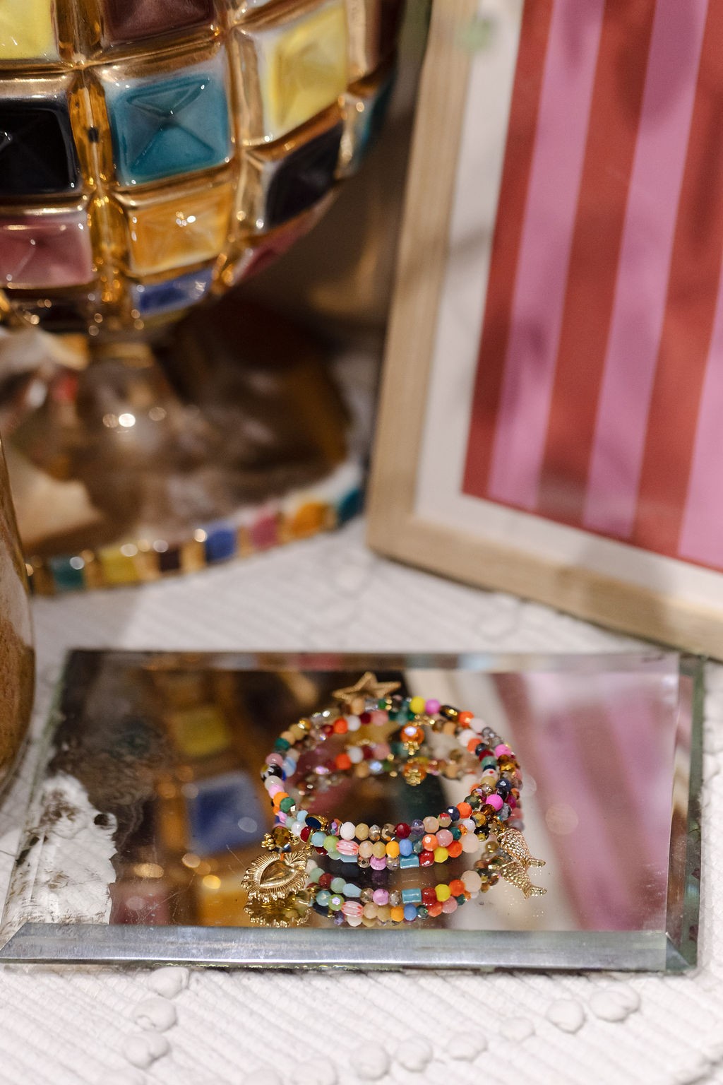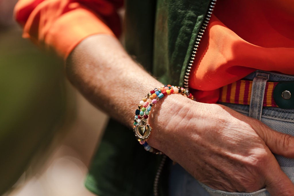 Bracelet monté sur fil à mémoire de forme, 3 tours, 3 charm's, perles multicolores.