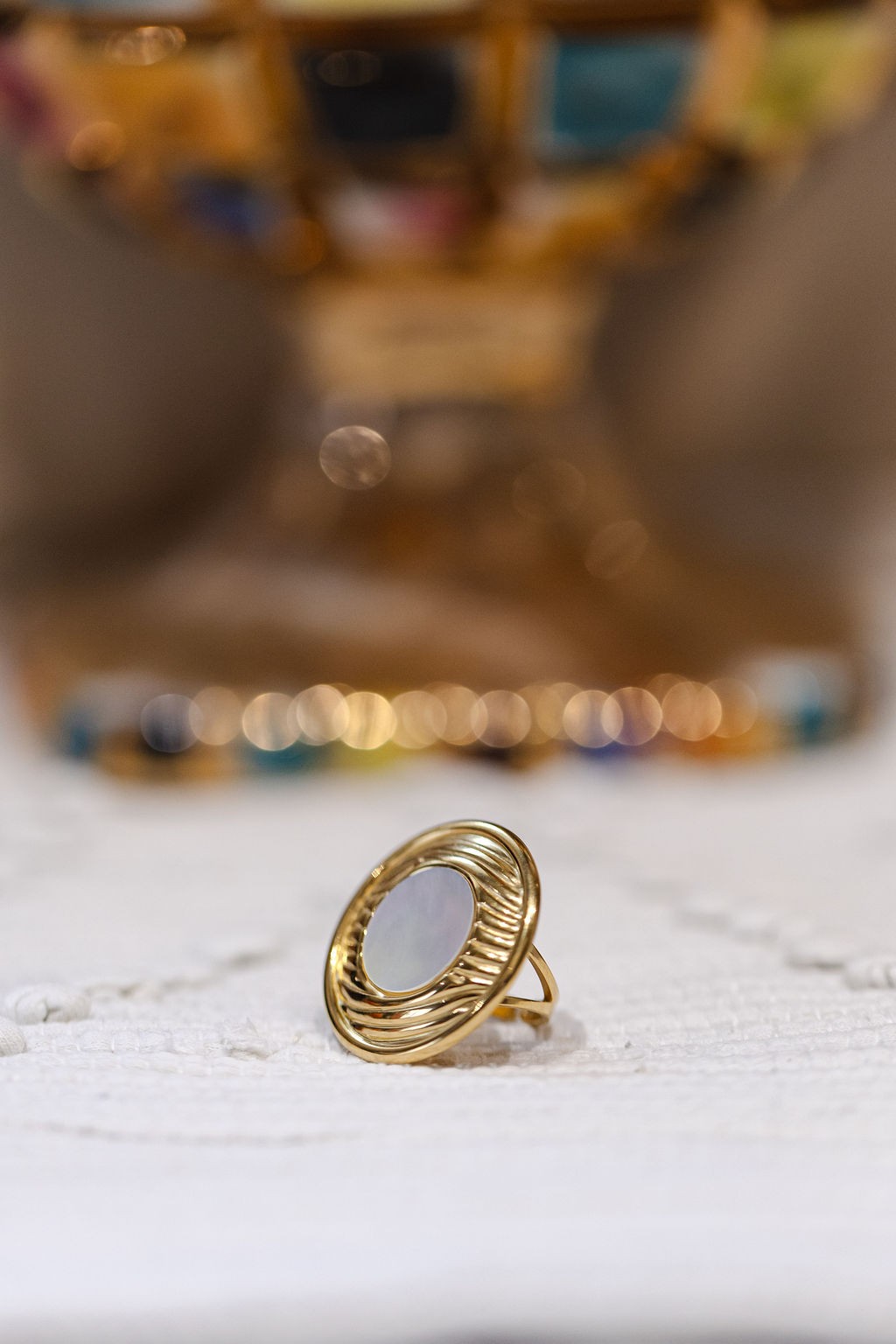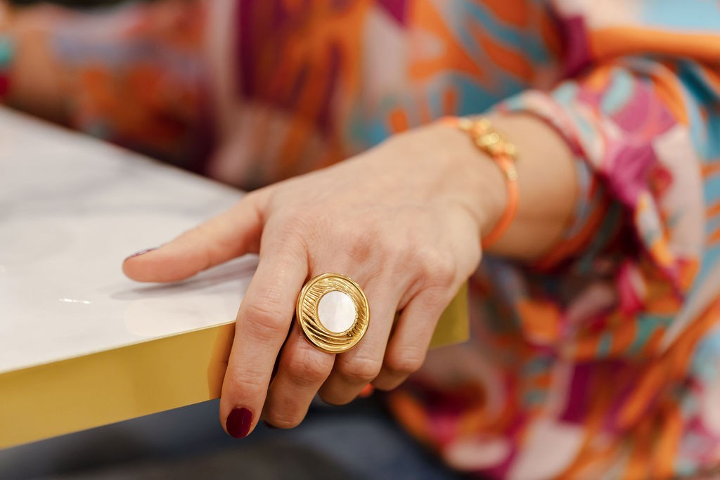 Bague ronde en acier inoxydable doré et nacre.