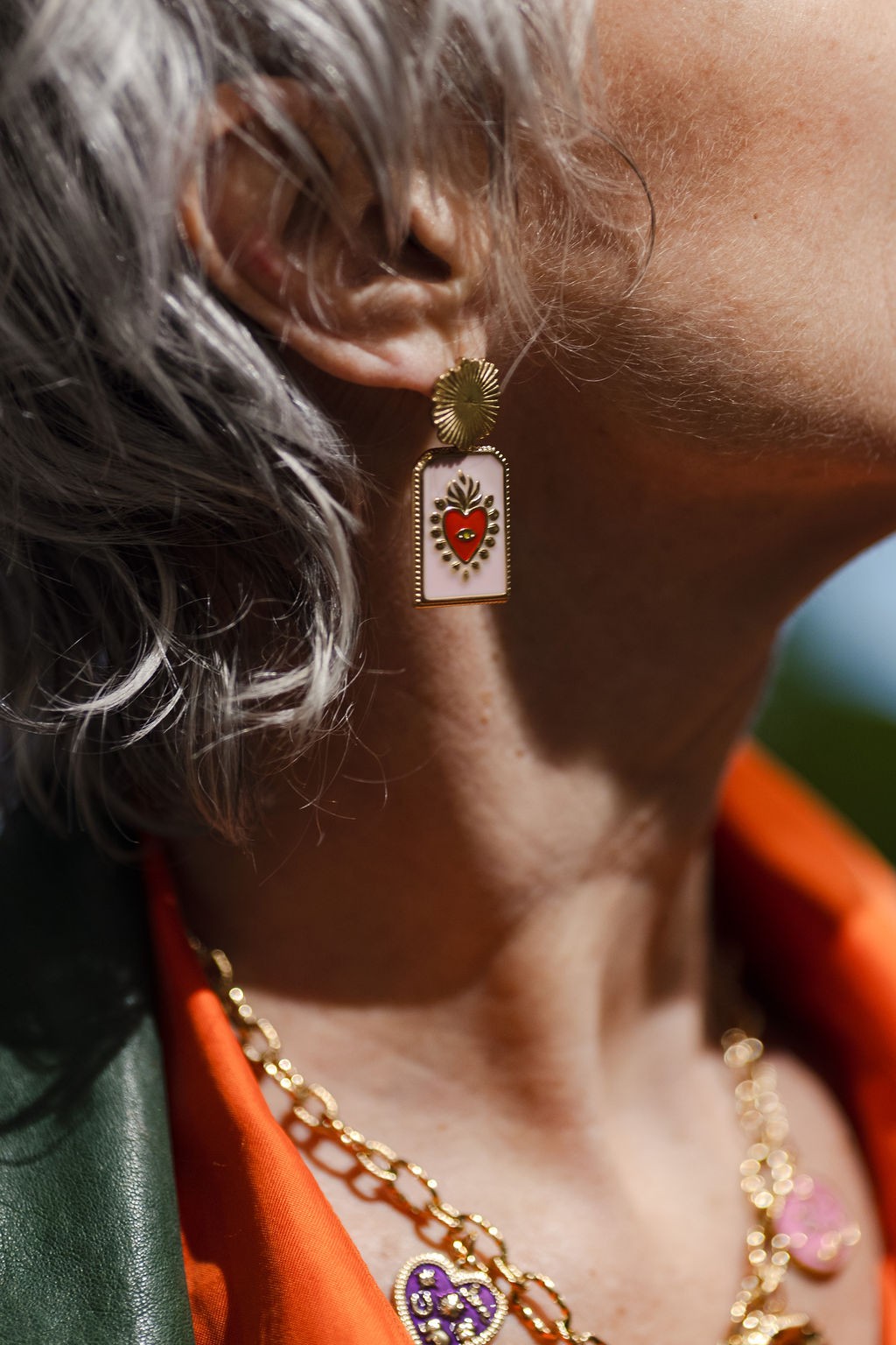 Description: Boucles acier inoxydable et ses beaux talismans coeur sacré rose et corail foncé.